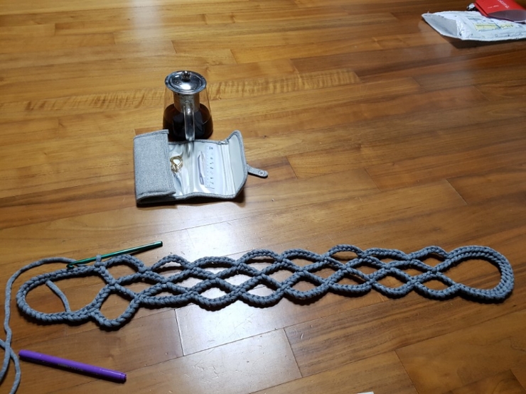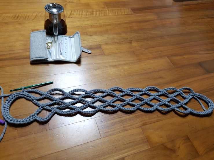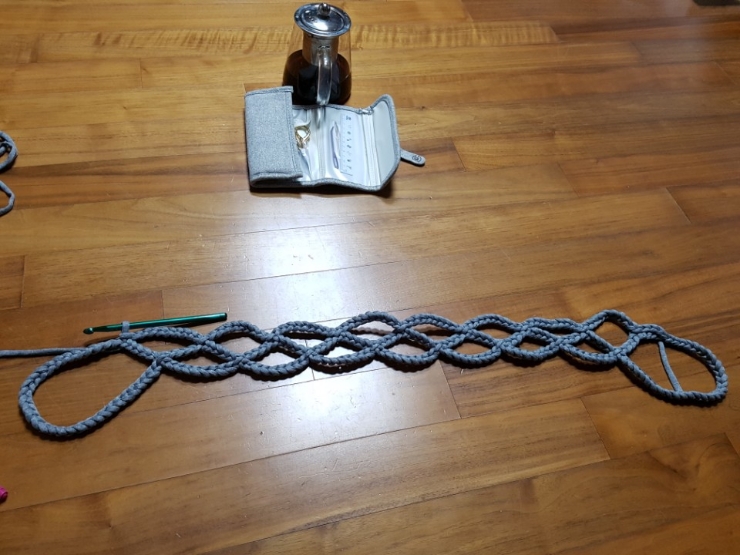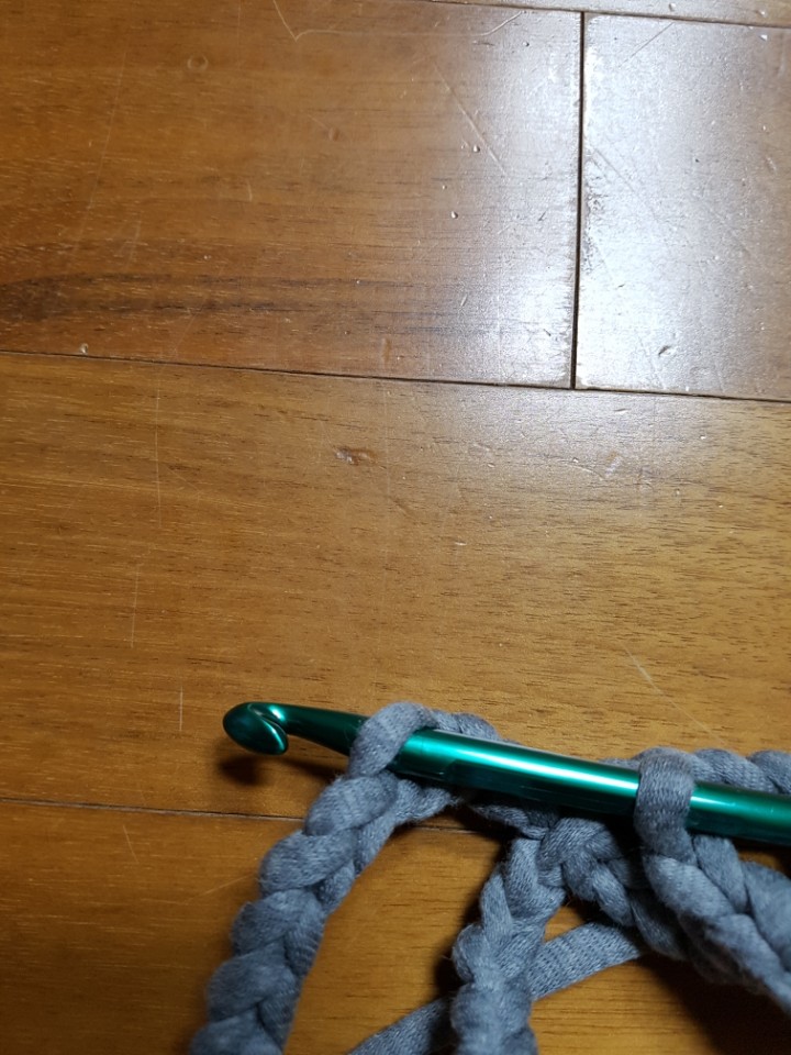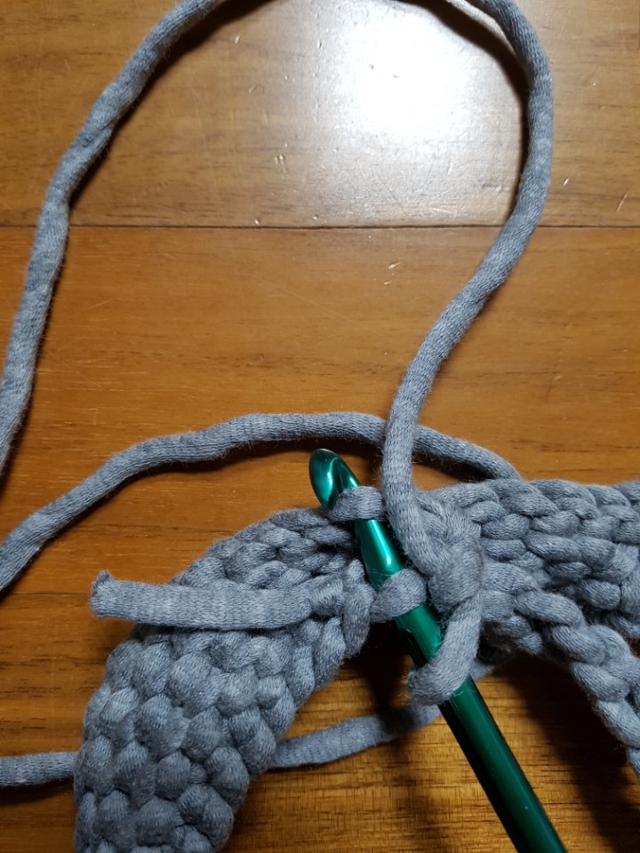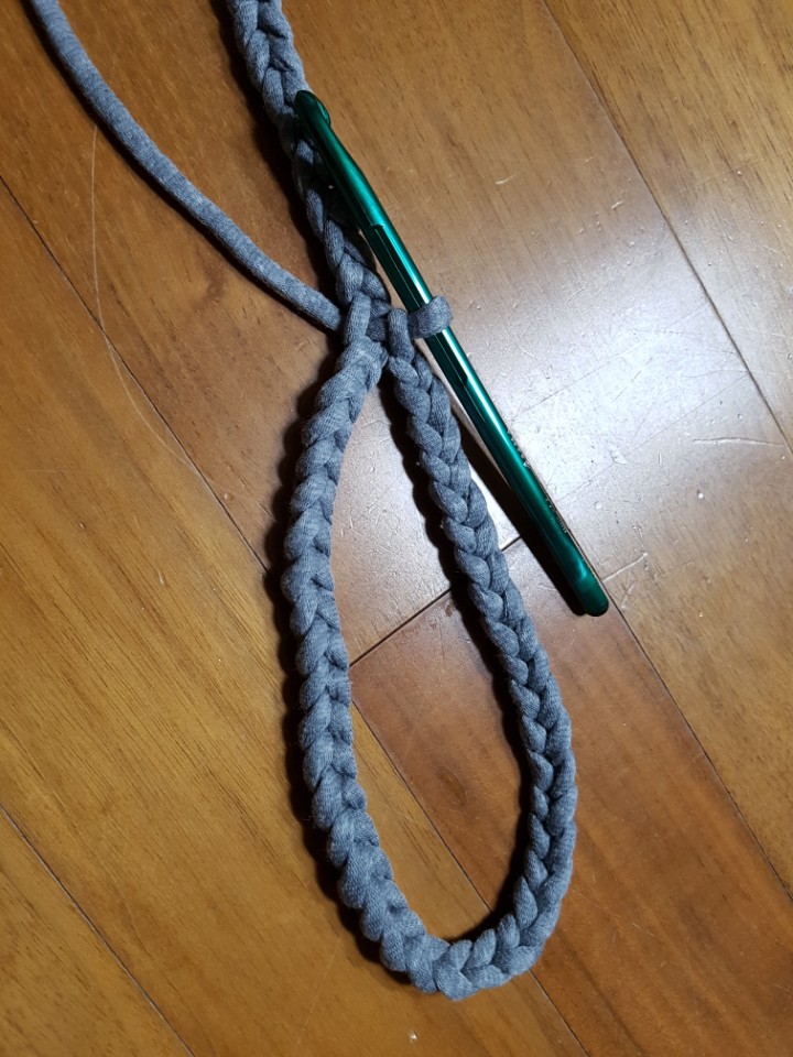 Затем вводите крючок одновременно в нижнюю и верхнюю петли ручки, как показано на фото, и стягивайте их с помощью соед. ст.