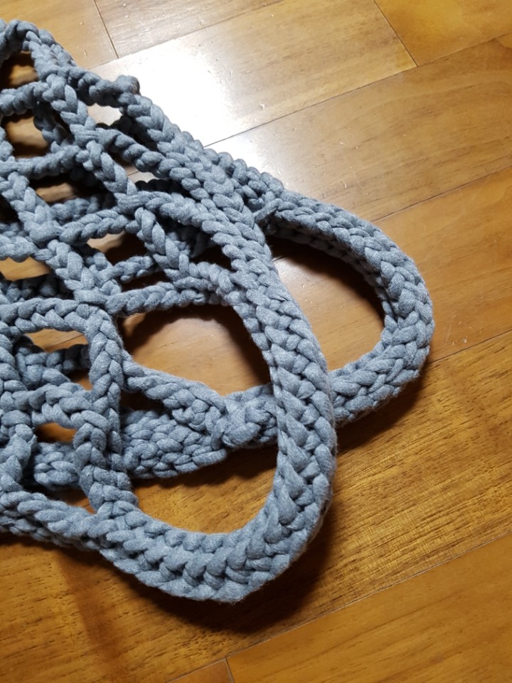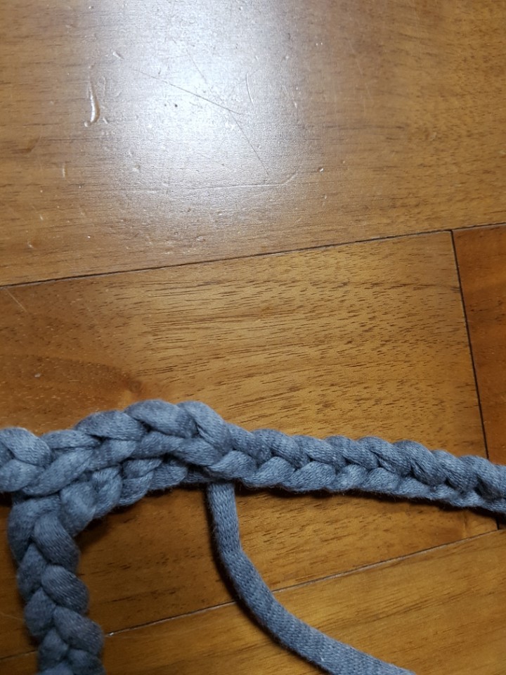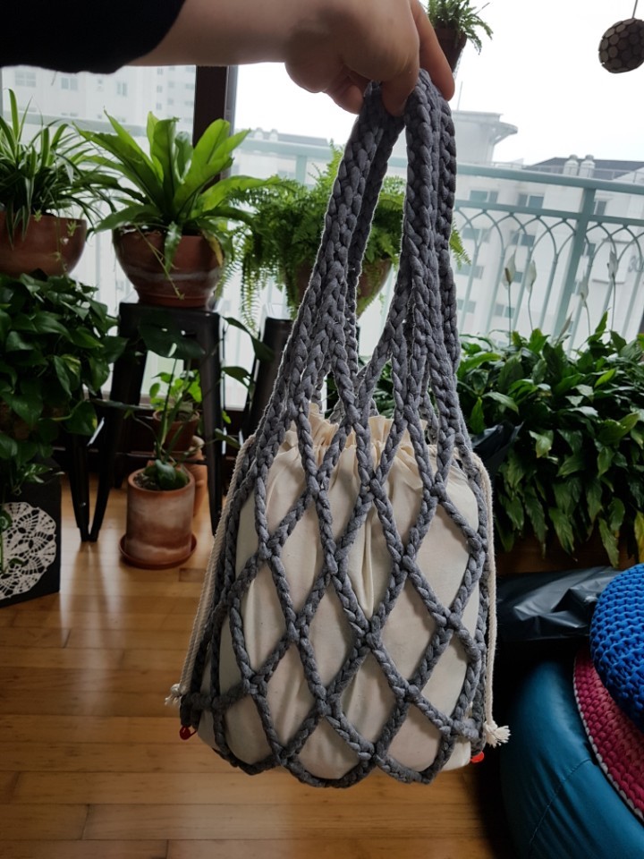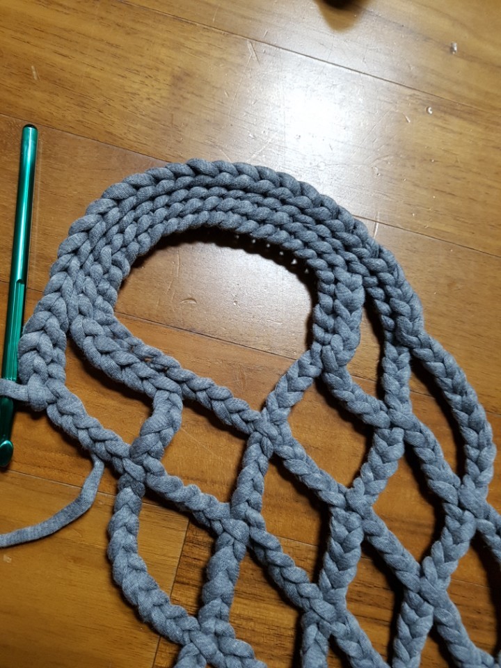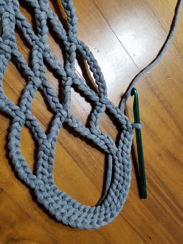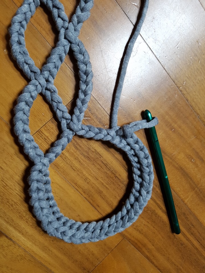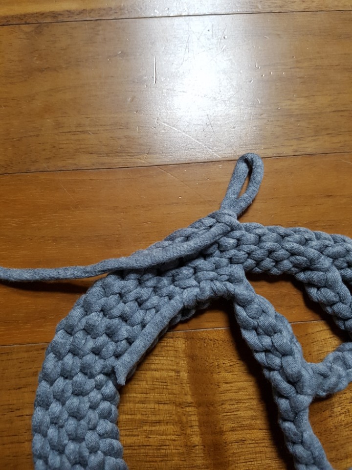 Оборвите нить, присоедините ее внизу с другой стороны сумки и соедините точно таким же образом.