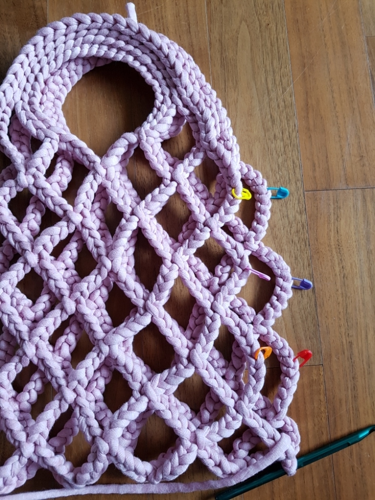 Для обвязывания ручки провяжите полустолбики в оставшиеся 4 п. последней арки из в.п. предыдущего ряда, во все петли предыдущего ряда и в 4 петли следующей первой арки, как на фото. Всего в ряду 29 полустолбиков.