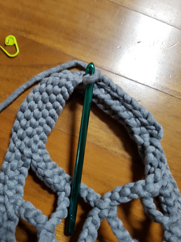 С этого места начинайте выполнять полустолбики вдоль одной ручки за заднюю стенку, пока не свяжете 39 петель.