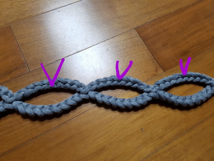 Разместите застегивающиеся маркеры для вязания в центральной петле первых и последних трех арок из в.п. (= всего 6 маркеров), как показано на фото.