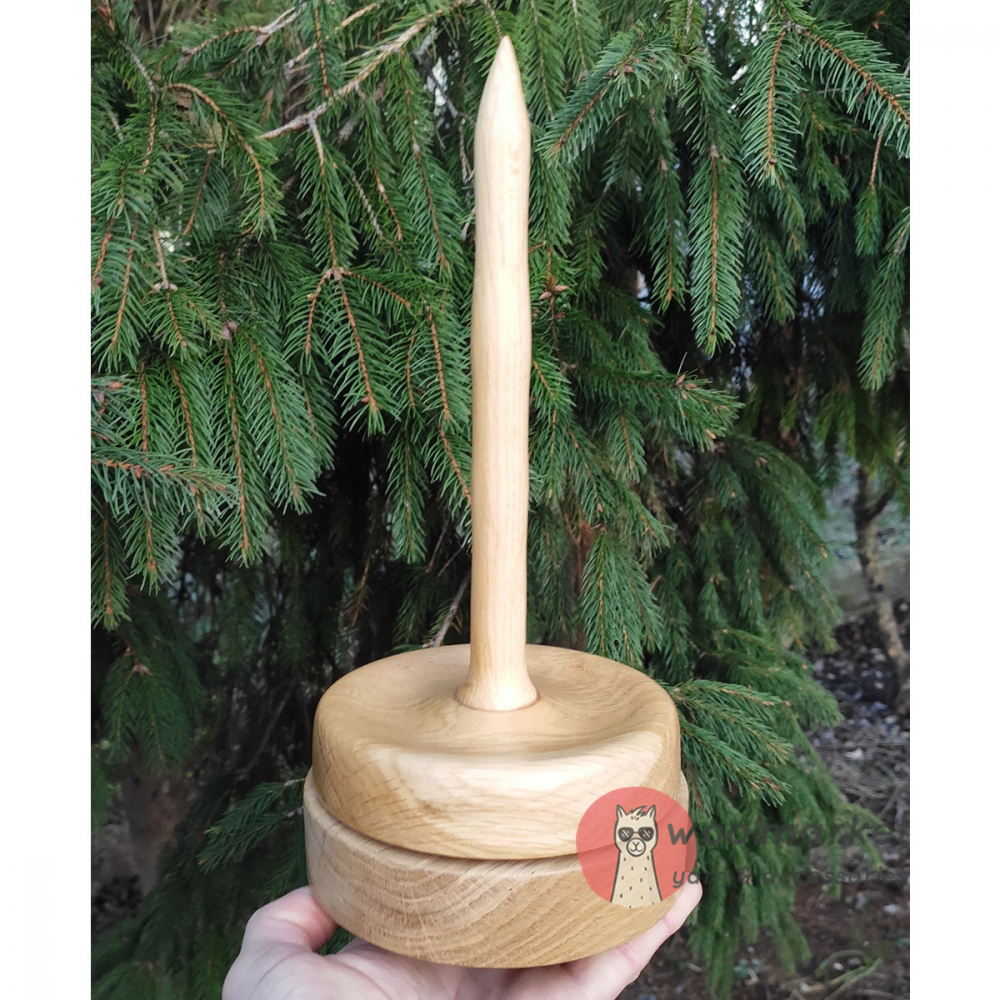 Дерев'яний тримач для пряжі - незамінна річ для майстринь ручної роботи. Складається з платформ (верхня і нижня) і шпиля. Така вертикальна підставка для пряжі підійде для в'язання зі звичайних клубочків і з бобінної пряжі, кауні або дундаги перемотаних в клубки (в'язане полотно з цих видів пряжі може значно косити). Бобінку або моточок потрібно надягти на шпиль тримача для пряжі. Нижня платформа стійка, верхня - крутиться разом з пряжею і таким чином не дає закручуватись ниточці, полотно майже або зовсім "не косить"!