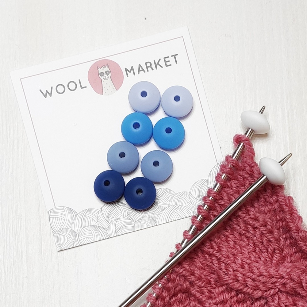 Стопери для шкарпеткових спиць, набір 6 (темно синій, світло і темно блакитний, білий) - практичні і яскраві силіконові наконечники для фіксації шкарпеткових спиць під час в'язання.
